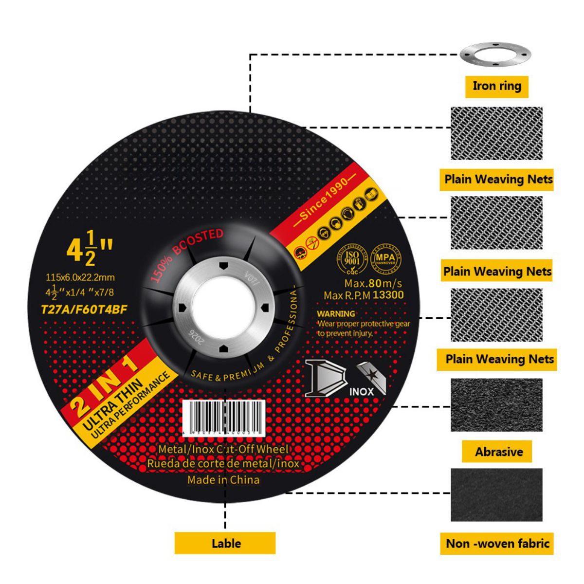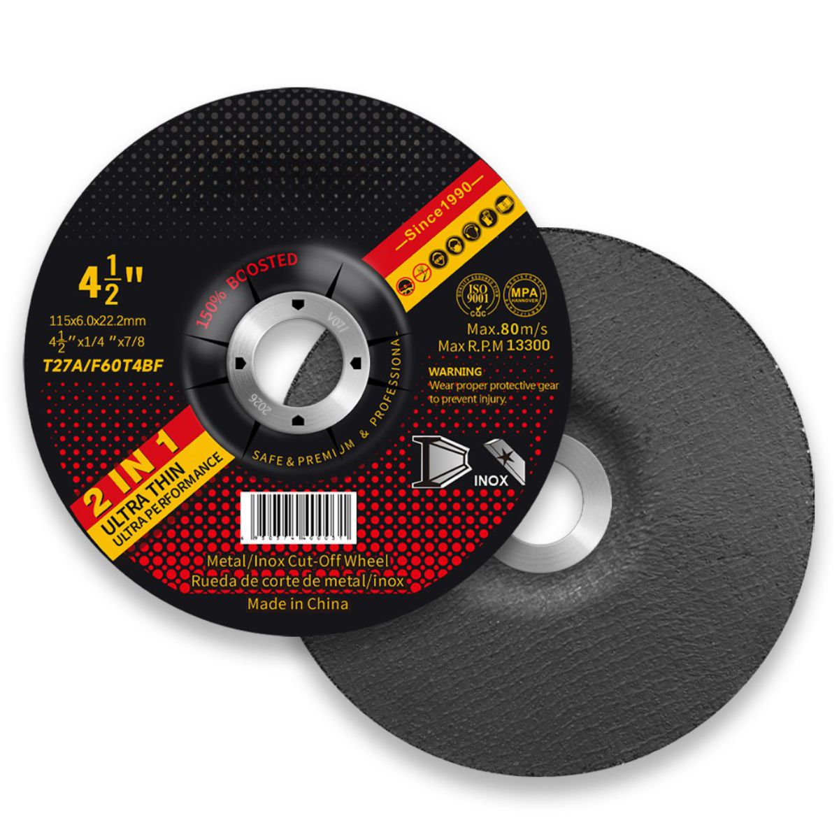 Como fabricante de muelas abrasivas especializado en el sector B2B, Qing Yang® ofrece un disco abrasivo de 115×6,0x22,2 mm con especificación T27 (disco abrasivo de 4,5 pulgadas) que cumple con los estándares industriales. Adopta un diseño de estructura con un espesor de 1/4″ y es adecuado para operaciones pesadas en metal y mampostería.